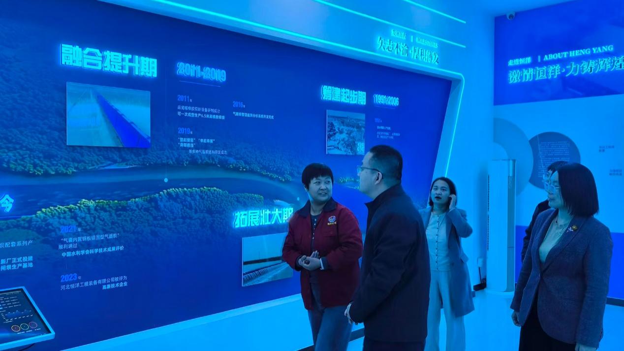 在河北恒洋工程装备有限公司,公司教师参观了企业展厅,详细了解了公司闸坝类产品的设计原理、技术特点及演示模型。企业负责人介绍,公司生产的气盾坝、橡胶坝、液压坝等产品,在机械设计、力学分析、结构优化等方面存在广泛技术需求,希望与公司开展专项合作,共同推动产品迭代升级、提升产品核心竞争力,双方就后续合作方向达成初步共识。