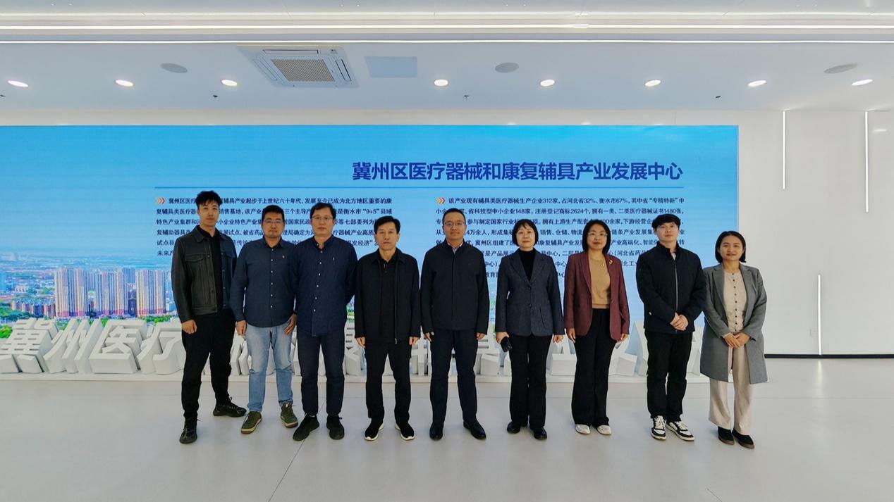 在冀州区工信局领导的陪同下,公司一行首先前往冀州区医疗器械和康复辅具产业发展中心参观考察。在现场讲解员的引导下,老师们深入了解了冀州区医疗产业集群的整体发展态势、产业布局及未来规划。展厅内陈列的展品涵盖医疗领域的全系列产品,其中面向未来老龄化社会的适老化空间家具等特色产品设计,获得了老师们的广泛关注。交流中,工信局相关负责同志结合区域产业发展实际情况,提出了若干亟待解决的设计类难题,希望借助公司工业设计学科优势和平台资源,为区域产业集群高质量发展注入设计活力与科技动能。